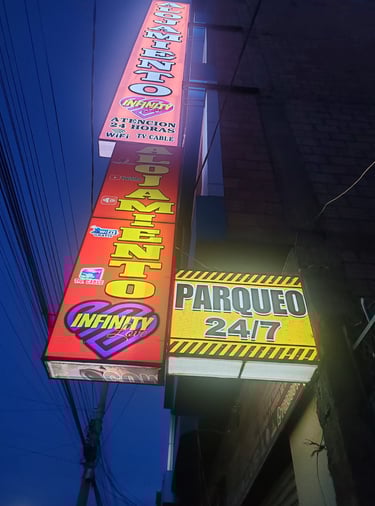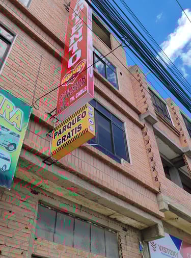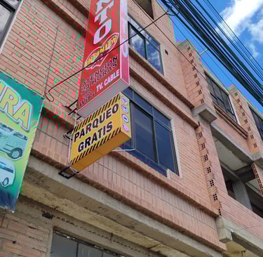 Habitaciones con baño privado completo (inodoro y ducha con agua caliente), WiFi gratuito, habitaciones dobles (matrimoniales), simples y parqueo privado incluido para tu vehículo, con seguridad las 24 horas.